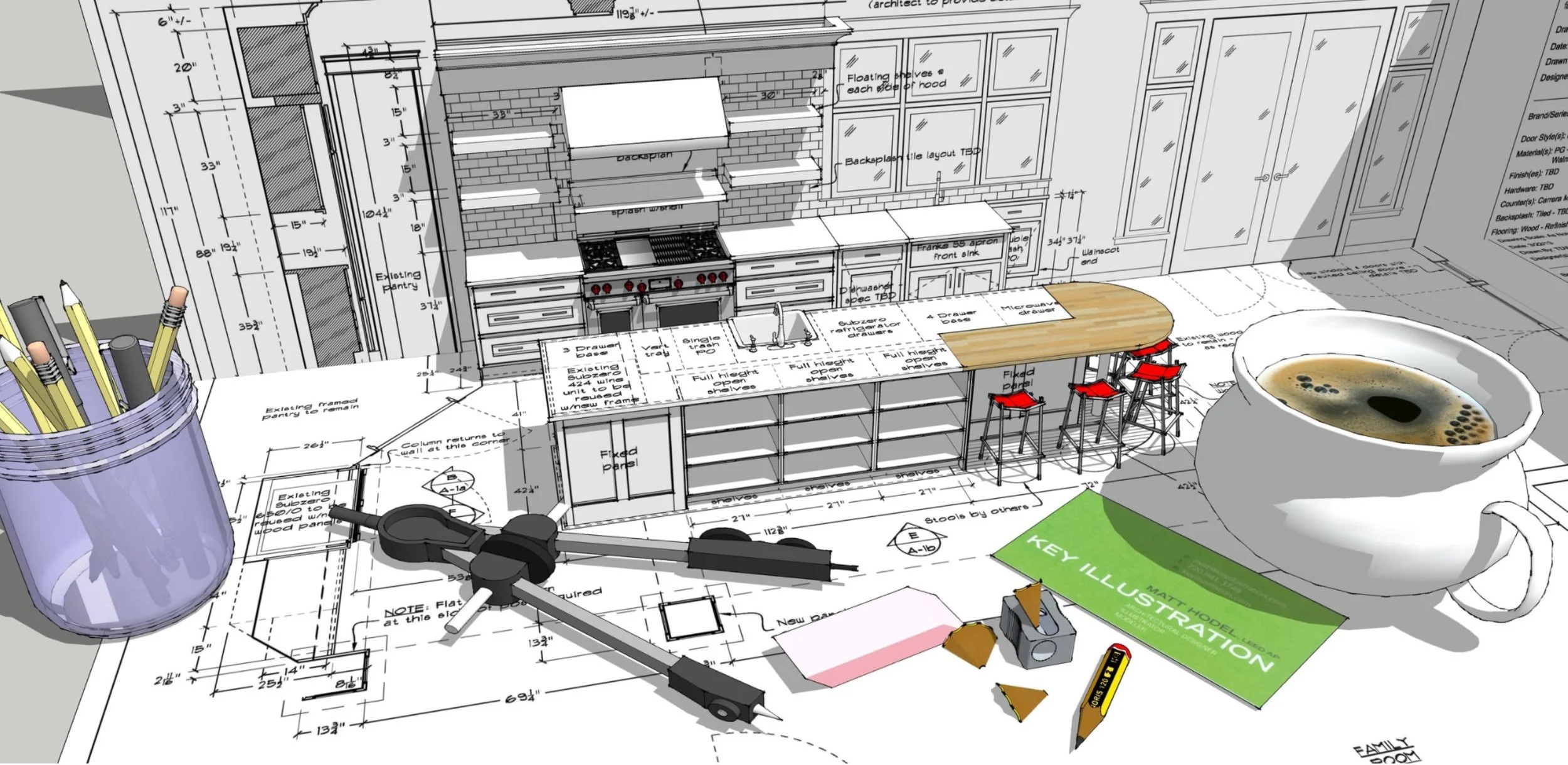 Denver resident Matt Hodel is the owner and lead designer of Key Illustration. His unique architecture and building contracting skills set him apart with a unique ability to bridge dreams, reality, and outcomes. Matt worked with his dad, Rich Hodel, a veteran, master craftsman, and well-respected custom home builder, in Peoria, Illinois. Rich Hodel is a man of unwavering principles with an intuitive understanding of construction as a craft, and he created timeless, stunning homes. His dad’s handed-down technical knowledge, patience, and love guide Matt through each project he touches on.